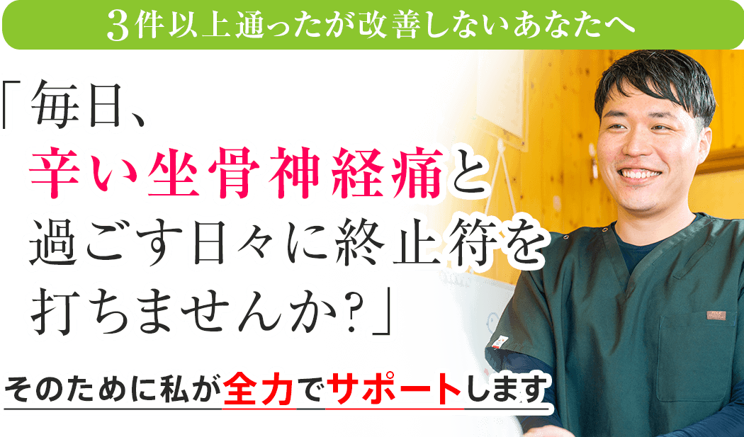誰よりもあなたの症状に寄り添い向き合って施術をする慢性痛専門整体院 拓-TAKU-に来院して、長年苦しめられてきた坐骨神経痛